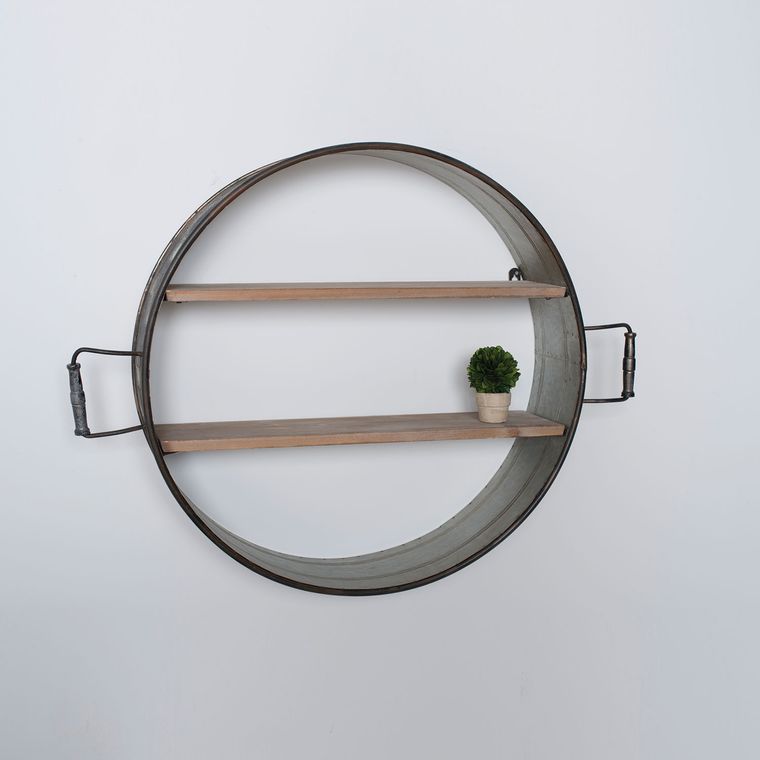Does your kitchen need more storage space? Then grab a Brimfield Round Shelf, perfect for shelving spices, small tools, and potted herbs. Its galvanized rim and solid wood shelves are finely constructed to allow this artistic storage space to meet your needs for years to come. Never run out of shelf space again with this unique, expertly crafted shelf. Measures 25.5" x 4.25" x 23.75".
